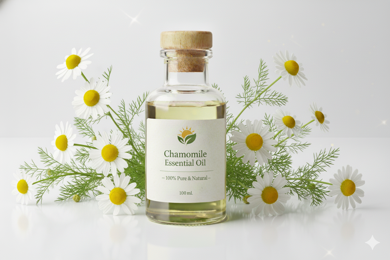 Chamomile Essential Oil is a soothing oil extracted from Chamomile flowers (Matricaria chamomilla or Chamaemelum nobile). It has a calming, sweet, floral aroma and is widely used in aromatherapy, skincare, and wellness for its relaxing, anti-inflammatory, and skin-soothing properties.